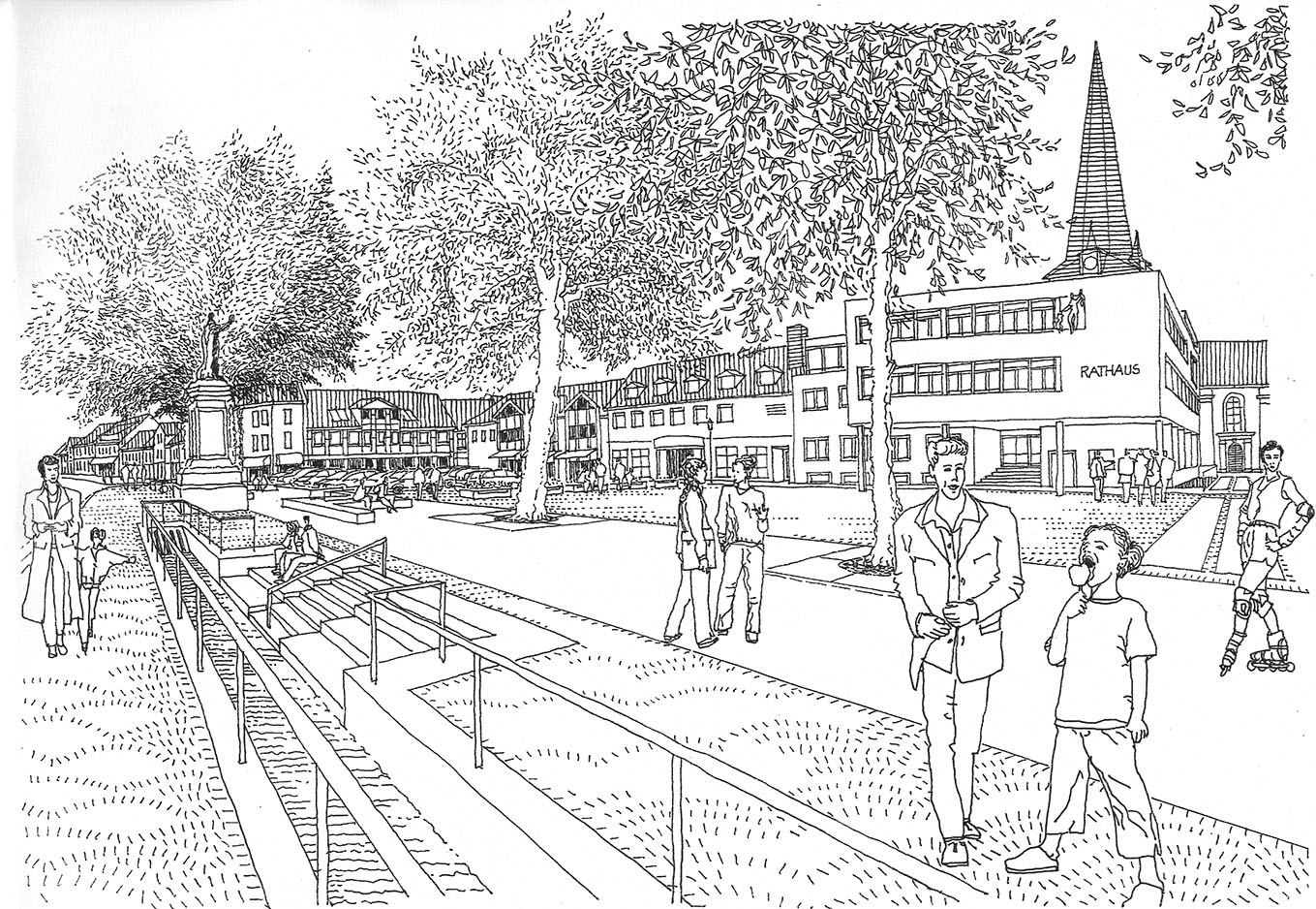 Wiederherstellung einer zeitgemäßen Platzsituation mit multifunktional nutzbarer Freifläche und Teiloffenlegung des Wasserlaufs der Altenau (Zusammenarbeit mit dem Ing.-Büro Damer & Partner).